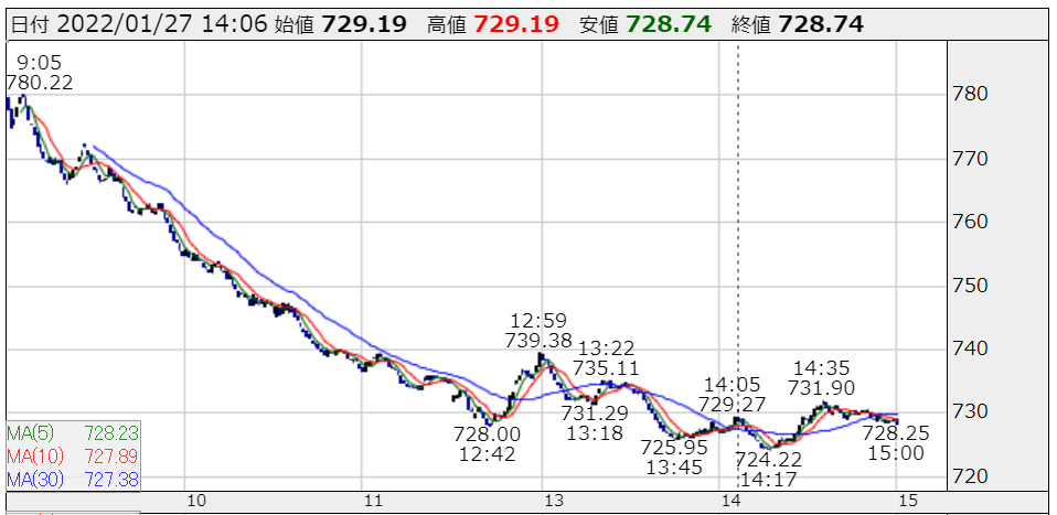 ただ、その後9時にかけて気配値を大きく下げ、最終的に前日比-80円で決済。