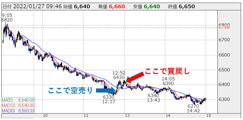 この2日間空売りで痛い目に遭っていた私は、ここで冷静さを失い瞬時に買い戻し。