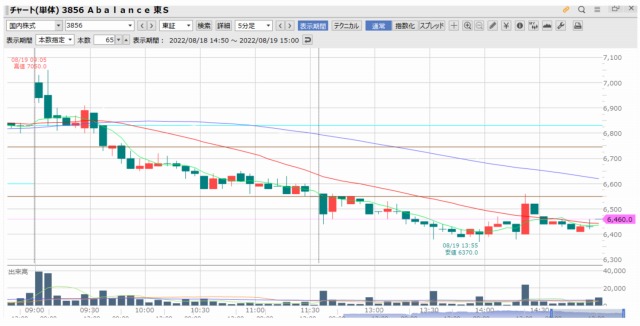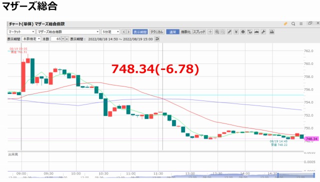 一方のマザーズも寄付き直後はどんどん上がっていったものの、その後はもの凄い勢いで下落。