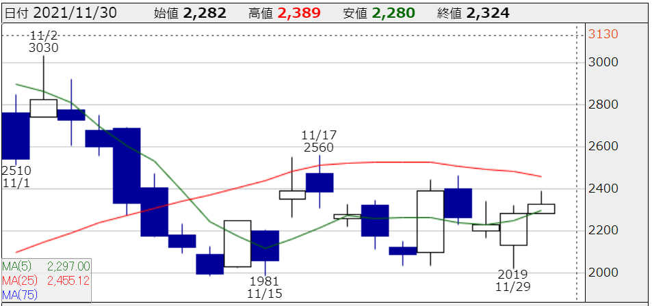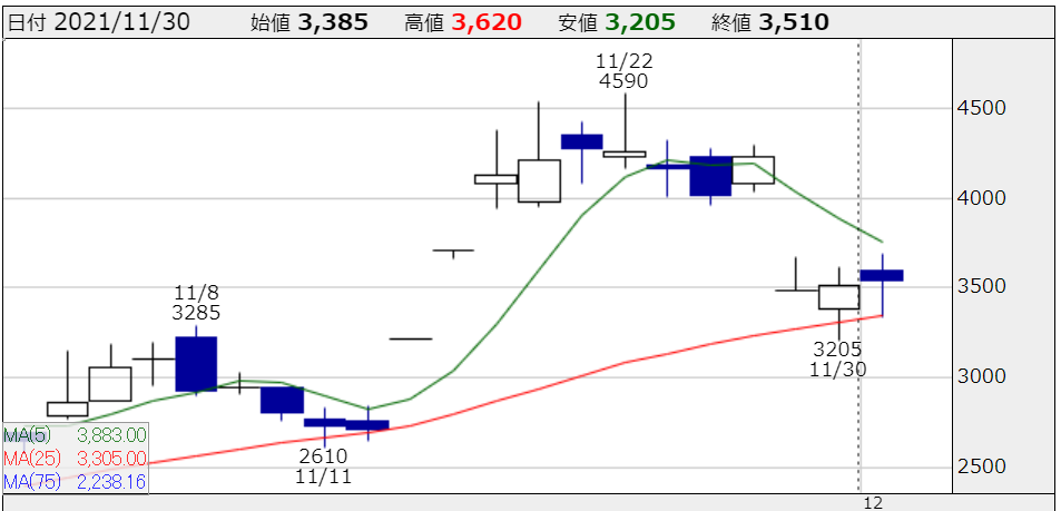 9月末にマザーズへ新規上場したこの銘柄は、当初は不調なスタートだったが、10月末にかけて大きな上昇曲線を描いていた。