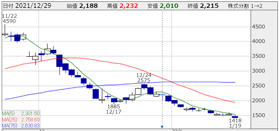 11月まで大きく利益拡大に貢献してくれたこの銘柄は、11月26日に発表した公募増資と業績下方修正を機に大きく売られ始めていた↓